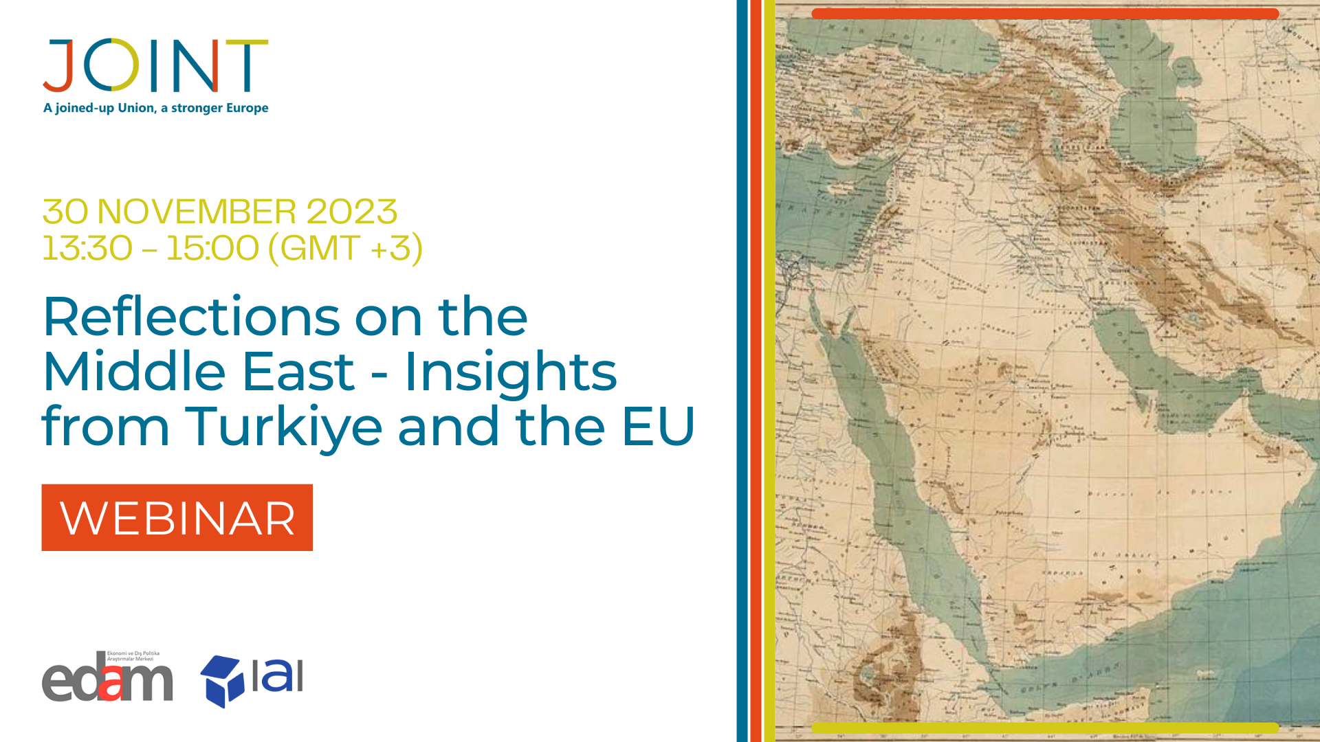 The webinar ‘Reflections on the Middle East – Insights from Turkiye and the EU,’ organised by EDAM in the framework of the JOINT project, aims to explore the policies of the EU and Turkiye amidst this conflict, delving into the regional dynamics that shape their approaches.